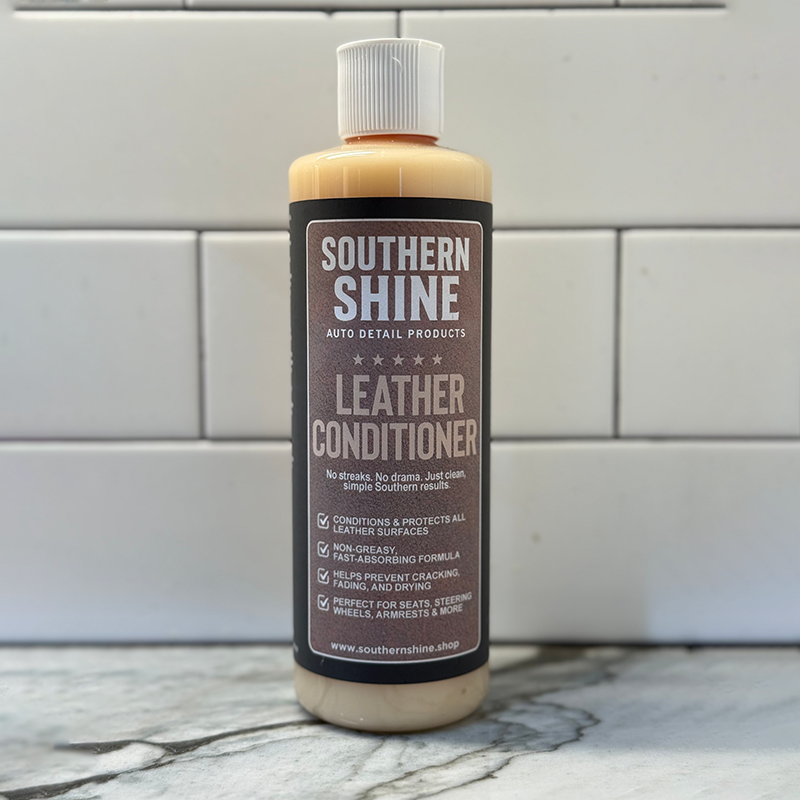 Keep your leather soft, supple, and protected with Southern Shine’s Leather Conditioner. This fast-absorbing, non-greasy formula restores natural oils to prevent cracking, fading, and drying while leaving behind a clean, natural finish. Safe for all automotive leather, it’s perfect for seats, steering wheels, armrests, and more. With long-lasting protection and comfort, leather care has never been simpler — no streaks, no drama, just clean Southern results.