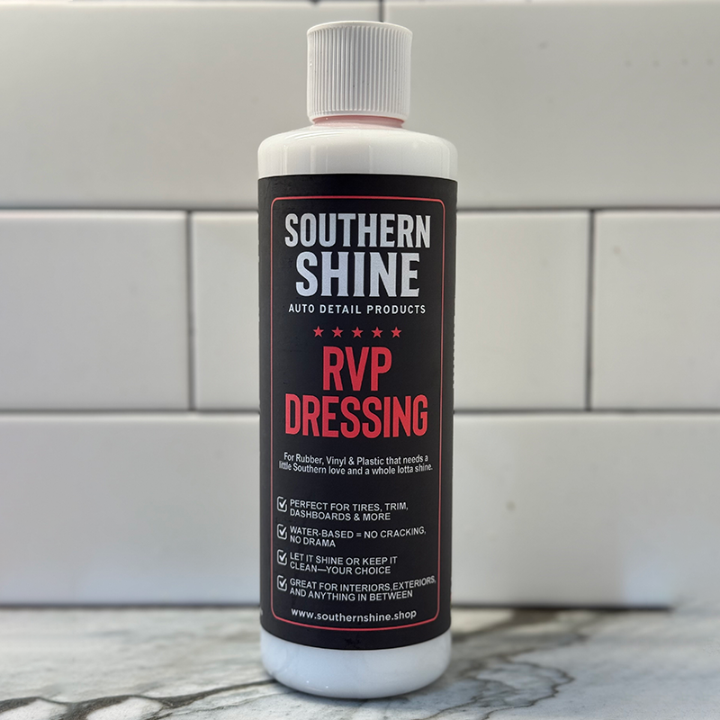 Bring faded surfaces back to life with Southern Shine’s RVP Dressing, the ultimate solution for restoring and protecting rubber, vinyl, and plastic. Whether it’s tires, trim, dashboards, or door panels, this high-performance formula delivers a deep, rich finish that lasts. Designed for versatility, it can be layered to achieve a high gloss shine or buffed for a subtle satin look. With built-in UV protection, it shields surfaces from sun damage and fading, while its water-resistant properties ensure it won’t streak or wash away in the rain. The non-greasy formula leaves a clean, smooth feel with no oily residue, making it the perfect choice for both interior and exterior use.
